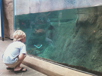After the shark tank, we hightailed it to TR’s second-favorite exhibit: the river otters! They were so cute and playful and energetic, and were swimming around, flipping underwater, jumping off things, and generally showing off nonstop while we were there! Townes couldn’t get enough of them and kept giggling when they’d do a flip, and giving me advanced notice when one of them was about to swim near us again.