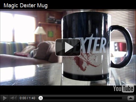 I just love this mug. The only unfortunate thing about it is that it isn’t microwave-safe. This is unfortunate because I take a really absurd amount of time to drink my cup of coffee in the morning, and usually have to reheat it about six times before I actually finish it. So sadly, my Dexter mug typically only sees me through my first twenty minutes or so, until the rest of my coffee has gone cold and I have to transfer it to a microwave-approved mug. Problem now solved, though, because I can drink out of another mug while watching this video over and over and still get the full effect.